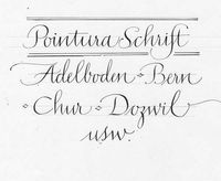 Wir schreiben mit einer sehr feinen Spitzfeder, teils mit Tinte, aber auch mit Wasserfarben. Sehr schön ist zum Beispiel auch weiss auf schwarz!